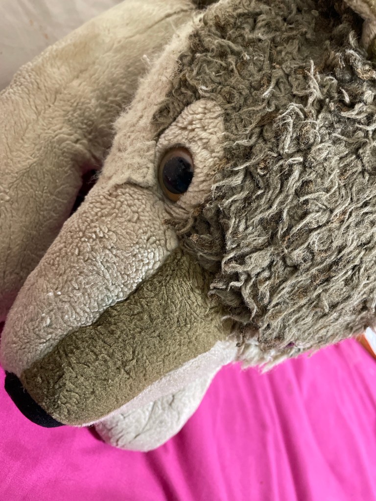 Remember my object of affection in my second book? This is him. Rescued from his spa day, stuffed with memory foam bits, all clean to cuddle. My winning move is cracking The Chiropractor Spot then laying sideways with him propping my body up. Better than sex.